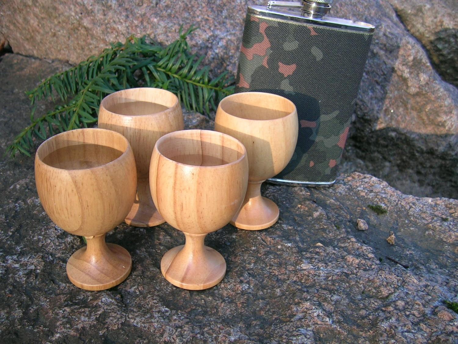4 stk drammeglass på stett i naturlig trevirke. Nyt drammene dine med et ekstra touch av natur! SKAL IKKE I OPPVASKMASKIN!