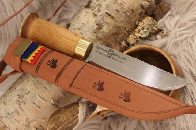 Denne kniven er ofte den første kniven barn får i 7-8 års alderen. Hendig dame / junior tur-kniv til slakting, sløying, skaving. Rustfritt stål i blad, skaft av behandlet bjørk.Vi kan inngravere på Skaft, Slire foran og bak