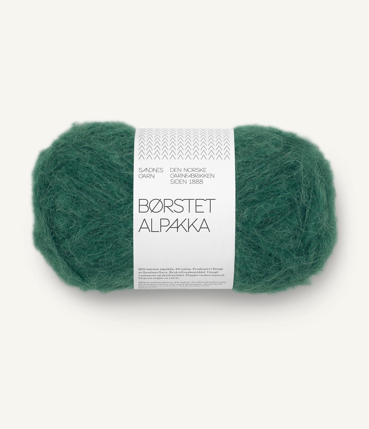 Børstet Alpakka består av alpakkafiber tvunnet sammen med en sterk nylontråd, som holder det hele sammen når alpakkafibrene blir børstet opp. Dette gir et mykt, lett og luftig garn med et loddent uttrykk.