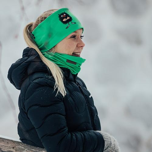 To-lags unisex pannebånd fra Moomin® by Davvin kolleksjonen i fargen grønn med print av Stinky. Et perfekt produkt for friluft og utendørs aktivitet til alle årstider, både for større barn og voksne i alle aldre.