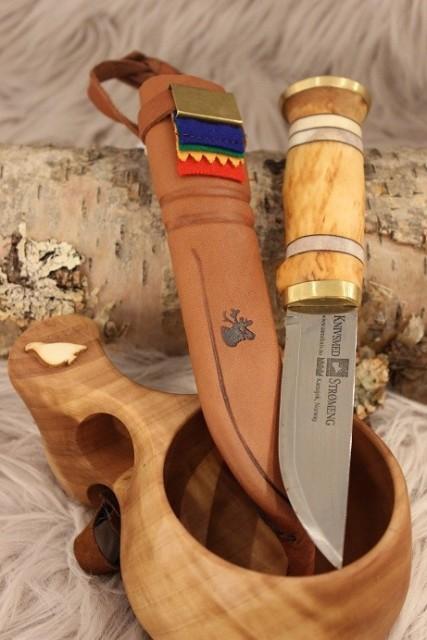 Denne modellen har skaft av masurbjørk, reinhorn og messing. Disse ligger montert lag på lag. Vi kan inngravere på skaft, ben, og på slire foran og bak