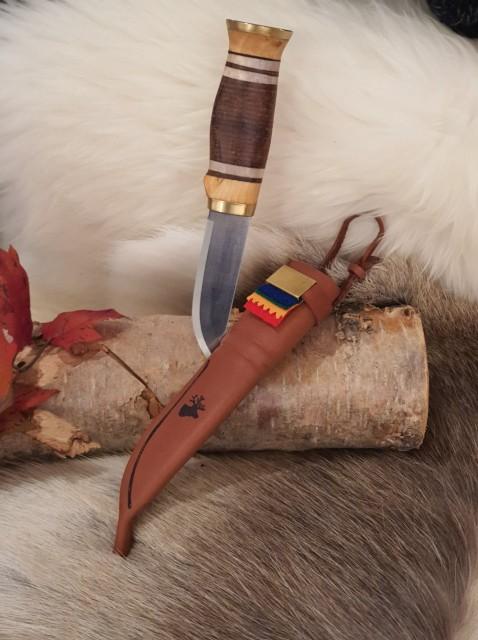 Denne samekniven har skaft av masurbjørk, reinhorn, messing, reinskinn og i tillegg okselær i senter. Disse ligger montert lag på lag. Blad av kull-/karbonsstål. Bladlengde 9,5 cm. Totalt 19,5 cm. Vi kan gravere på bein / tre / slire nav, dato , årstal