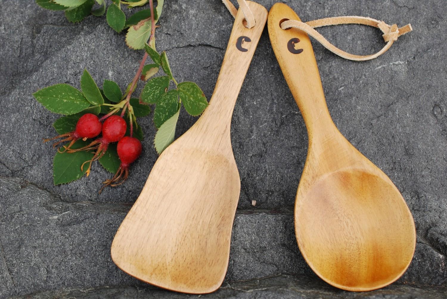 Stekespadesett i naturlig trevirke – solid, lett og miljøvennlig! Inkluderer sleiv og øse, perfekt for kokkelering i naturen. Settet passer inni pannen, som gjør transport enkelt.