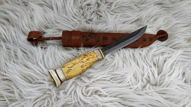 Praktisk kniv til spikking og enkelt turbruk. Stålblad (ikke rustfritt) og reinhorn i skaft. Flotte beindetaljer!